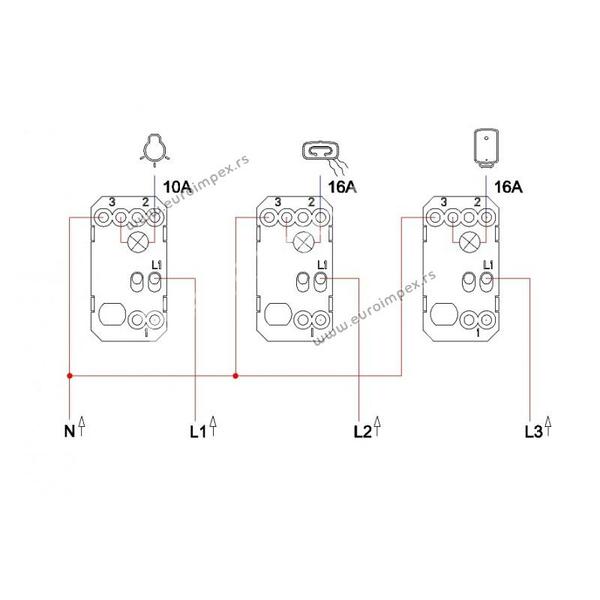 Sklopka za kupatilo sa indikatorom za tri nezavisna kruga 10AX/2 x 16AX 250V~