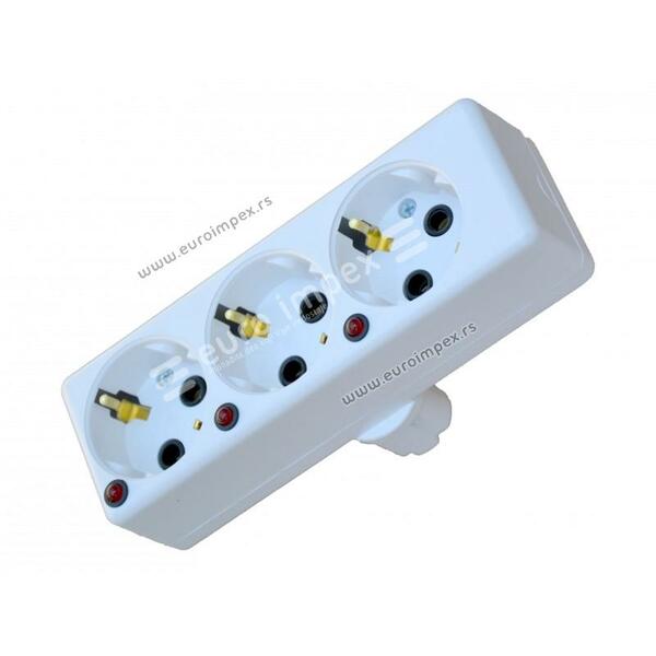 TROFAZNO MONOFAZNI RAZVODNIK 3x16A/250V je proizvod koji se koristi u elektricnim instalacijama gde postoje trofazne uticnice ( industrijske instalacije , kucne instalacije, škole, bolnice ....). Namena proizvoda je da u prostorijama gde su instalirane tro- fazne uticnice, a postoji potreba za monofaznim napajanjem upotrebom trofazno monofaznog razvodnika, elegantno bez pre- pravki na elektricnim instalacijama se to ostvaruje. Proizvod je tako koncipiran da se sa jedne strane nalazi trofazni utikac, a sa druge strane su tri monofazna uticna mesta pri cemu je svaka uticnica povezana na posebnu fazu. Ovo rešenje nudi mogucnost maksimalnog iskorišcenja postojece fiksne instalacije. Svako monofazno uticno mesto nudi mogucnost povezivanja potrošaca cija struja ne prelazi 16A ili 3500W. Proizvod trofazno monofazni razvodnik 3x16A/250V se radi u dve varijante sa i bez indikacije prisustva faza. Indikacija prisustva faza daje vizuelnu informaciju o postojanju faze za svako monofazno uticno mesto pojedinacno.