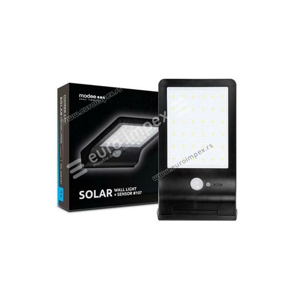 Modee 107 je korisna solarna lampa visokog stepena osvetljenja, za zidnu montažu. Radi uz pomoć polikristalnog solarnog panela, koji se tokom dana puni sunčevom svetlošću, tako da SMD LED u njemu može da pruža osvetljenje noću i do 8 sati. Takođe je opremljena senzorom pokreta, tako da ako detektuje kretanje u krugu od 3-5 metara, nivo osvetljenja raste do 300 lumena. Ako ne detektuje pokret, ponovo će se zatamniti 10 do 20 sekundi kasnije. Temperatura boje joj je 6000K, što znači da emituje hladnu svetlost. Lampa se napaja iz jedne Li-jonske baterije 18650, nominalnog napona od 3,7V i kapaciteta 2000mAh (koja se može puniti i zameniti).