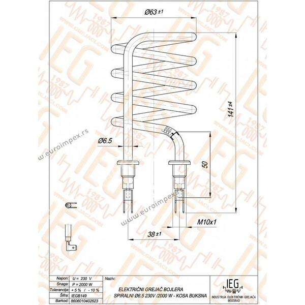 GREJAČ BOJLERA 2kW Cu fi6.5 KOSE BUKSNE IEGB149