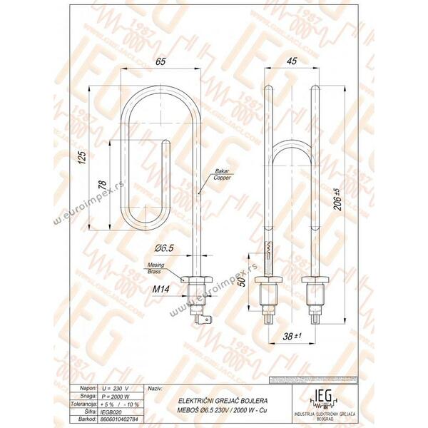 GREJAČ ZA BOJLER 2000W MEBOŠ fi6.5 2kW Zn/Cu IEGB020