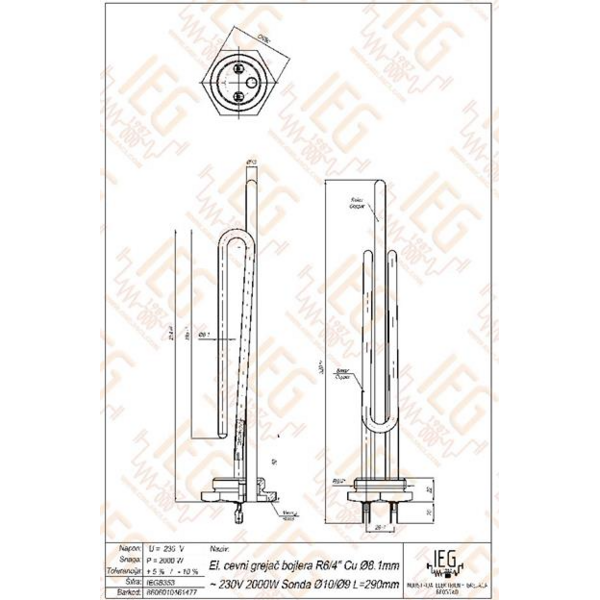 GREJAC ZA BOJLER 2000W R6/4 Cu fi8,1mm SONDA fi10/fi9 l=290mm IEGB353