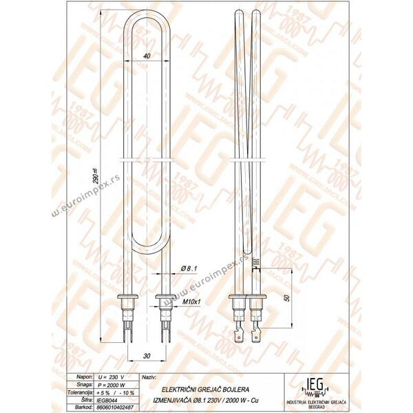 GREJAC ZA IZMENJIVAC BOJLERA 2kW fi8,1 Cu IEGB044