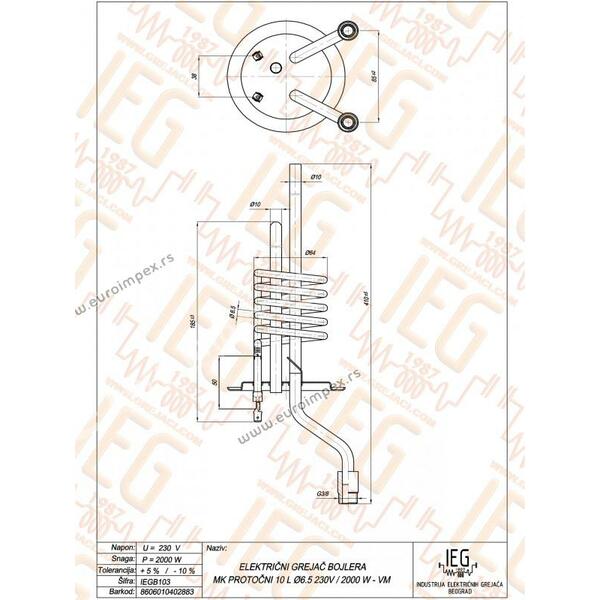 IEGB103 El. cevni grejač bojlera MK protočni 10L VM Cu Ø6.5mm ~ 230V 2000W sonda Ø10/Ø9 L=160mm