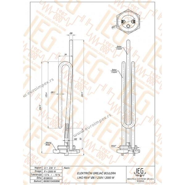 IEGB033 El. cevni grejač bojlera ARISTON R5/4" Cu Ø8.1mm ~ 230V 2000W sonda Ø8/Ø7 L=290mm