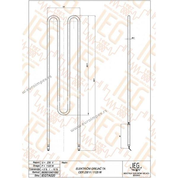 IEGTA020 El. cevni grejač TA peći CER Inox Ø8.1mm ~ 230V 1125W L=500mm