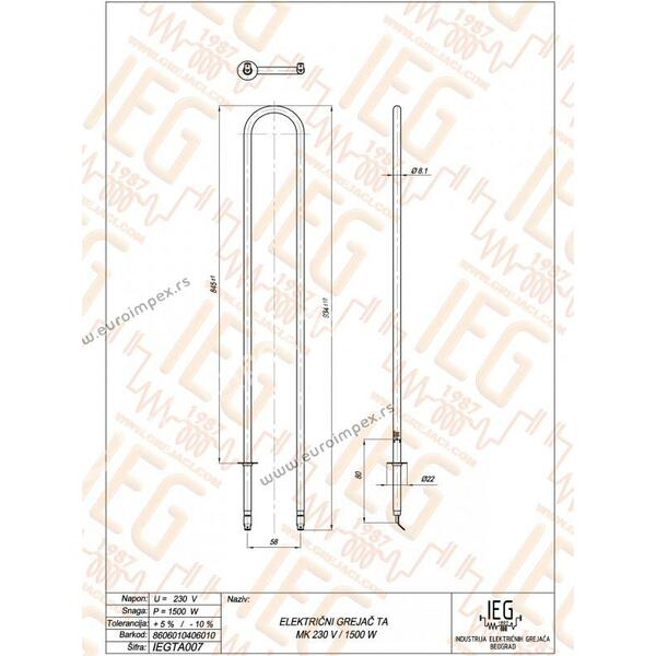 IEGTA007 El. cevni grejač TA peći MAGNOHROM Inox Ø8.1mm ~ 230V 1500W L=900mm