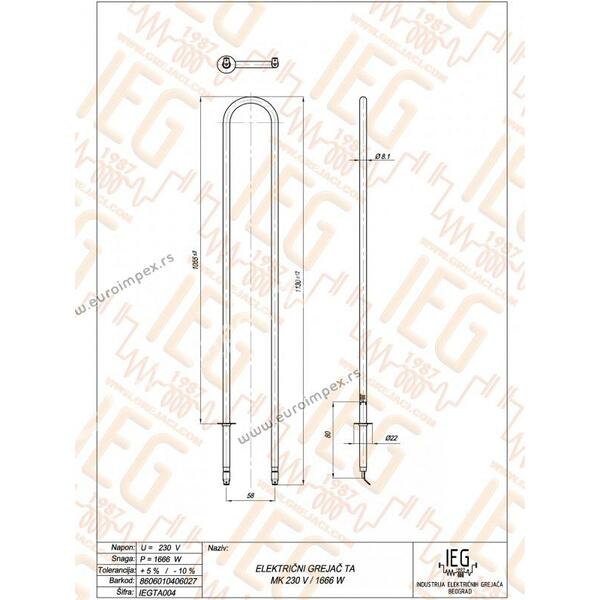 IEGTA004 El. cevni grejač TA peći MAGNOHROM Inox Ø8.1mm ~ 230V 1666W L=1120mm